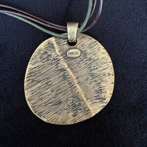 The gold-tone pendant is suspended from a triple set of cords in browns and olive, gathered into coordinating gold hardware.