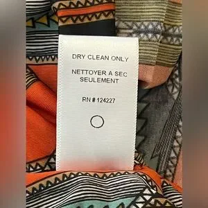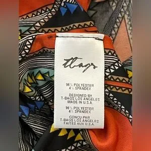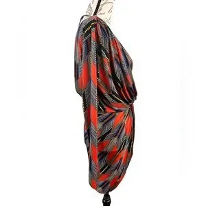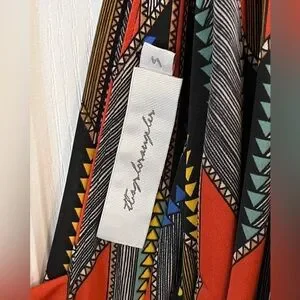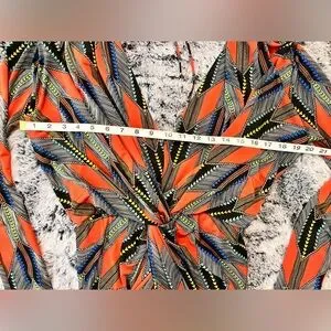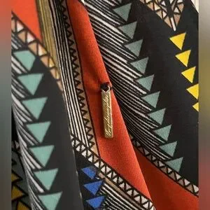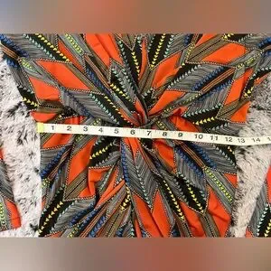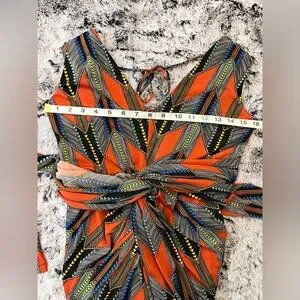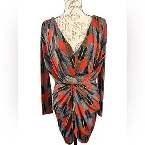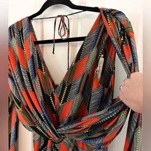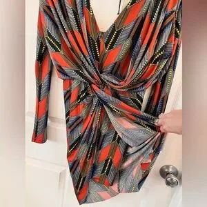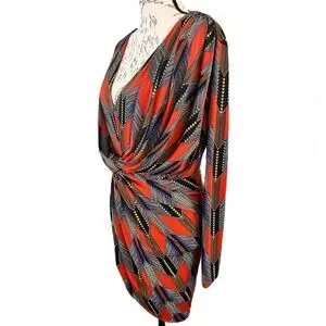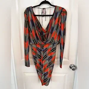 Multicolored orange geometric print, deep V-neck, layered Bodycon cut. Mini length. Long sleeves. Stunning design and craftsmanship. Raw hemline, tank top style underlay, tie detail at back neckline. Very artistic. This stunning dress is in excellent used condition. Please refer to pictures for condition and measurement details. Sold at Revolve.