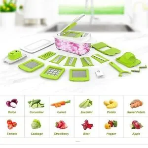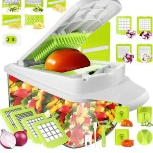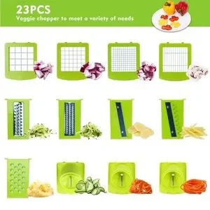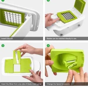 Vegetable Chopper Dicer Slicer Cutter contains blades for big / small dice, thick / thin slice, shred / julienne, spiral / ribbon. Blades snap in and out with ease to cut fruit, pepper, potato, tomato, onion, cucumber, carrot, beet.