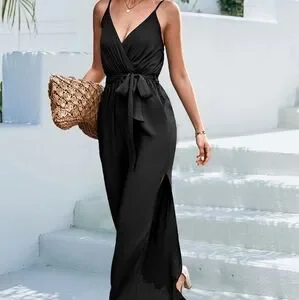 Make a statement with this stylish jumpsuit, featuring a flattering tie belt, sleek spaghetti straps, and a bold slit. Perfect for a night out or a special event, this jumpsuit is a must-have addition to your collection.