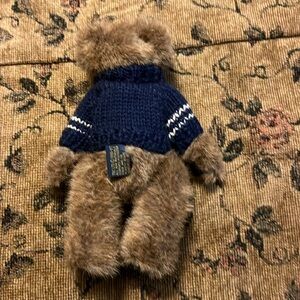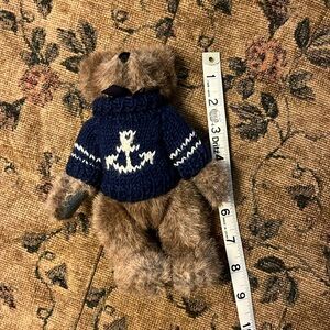 Cute brown bear with moveable arms and legs wearing navy sweater with anchor design.