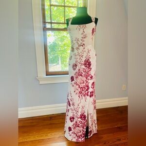 It has a square neck-line, fitted throughout, left leg slit with some subtle pleats at the hip. Smocked back w/ non-adjustable straps. Fully lined! Worn once with some mild wear and tear shown in pictures.