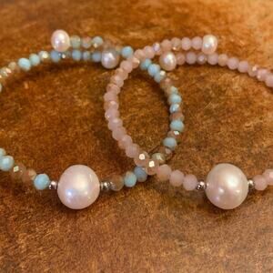 Two freshwater pearl and crystal bracelets. In light pastel colors with large freshwater pearl center and a smaller fresh water pearl on each end. One is a combination of light blue and brown crystals, the other one is light pink crystals. On wire so wrap around wrists. Great to share!