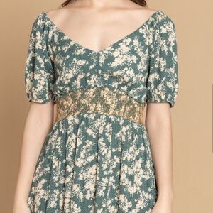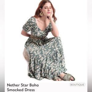 NWT Boho sage green flower print smocked dress w/ pockets! Bohera size L