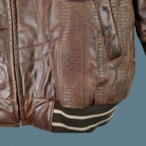 Y2K Vintage Heavy Leather coat with intricate patches and embroidery, and a retro looking striped waist band.