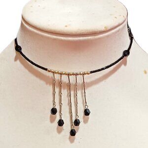 Handmade Black and Silver Beaded Fringe Choker Memory Wire Necklace