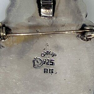 This is a great vintage pendant that can also be worn as a brooch. Carved Obsidian into a stylized Mayan warrior face. His head gear is sterling silver, looks really art noveau style. Elegant. Light patina on silver. As shown in photos. The back is stamped "AB', "925", "Mexico" and has an Eagle 1 stamp. Pendant is 2" long, 2.5" long with the earrings. Weighs 27.188 grams.