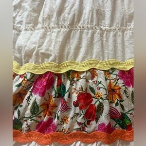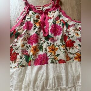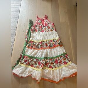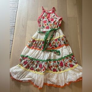 This tropical floral maxi dress in a tiered design blending panels of bold tropical florals, multicolor scalloped trim and lace.