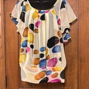 Head turning, colorful polka dots on a sheer, flutter capped sleeve top! Unique and fun!