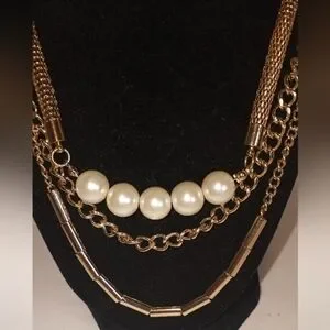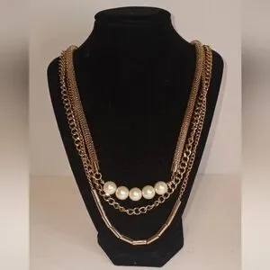 ONE piece Stacked necklace 5 faux pearls & 3 chains gold toned metal NWOT