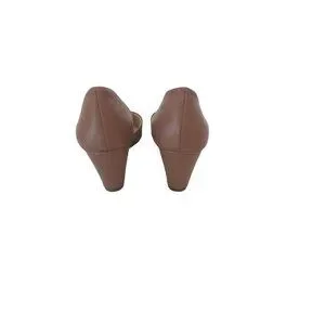 Nice pair of Kenneth Cole Reaction sandals that have a wedge style heel. Slip them on and away you go. Leather on the shoes and heels while the bottom is some kind of rubber. The shoes are in nice shape. At one time there was a sticker on the bottom of the shoes with the size/price. Once removed it left a mark on the bottom. The uppers are in nice shape. Tan shoes in size 7 1/2M. Nice low heel that measures about 2 1/2" high.