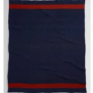 Reversible Pendleton Wool blanket with leather carry straps. Bridger Stripes on one side and a mostly-solid pattern on the other. Solid side is navy with red stripes. The straps make it easy to bring along and use over the shoulder or as a gathering spot in the park.