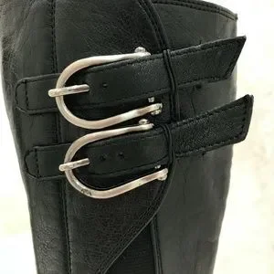 Silver tab buckles at calf