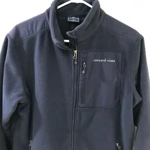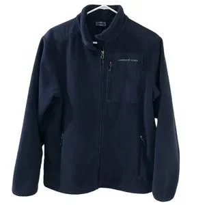 Navy blue full zip fleece with vertical zipper front breast pocket with logo and logo at nape