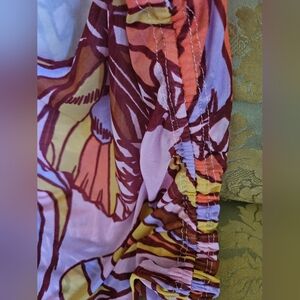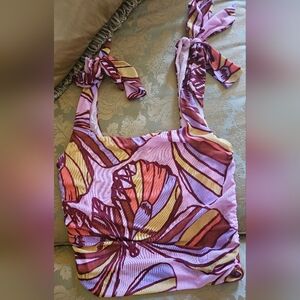 Features drawstring from the sides and adjustable bow ties on the top shoulder.