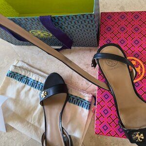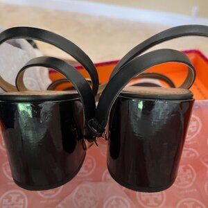 Close to perfect worn less than 5 times Tori Burch 9M, heel 2.6", Patent and smooth leather, Buckled ankle strap, Leather lining & sole. Black with Gold Tory Emblem. Great for a night out dancing or a day brunch by the beach! These shoes make a statement wherever they take you! Comes with envelope, box, Tory shoe bag, all the bells and whistles :)