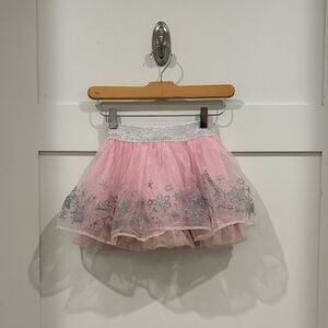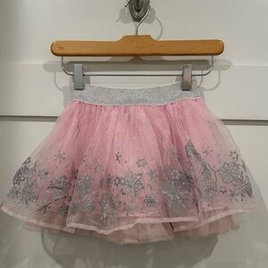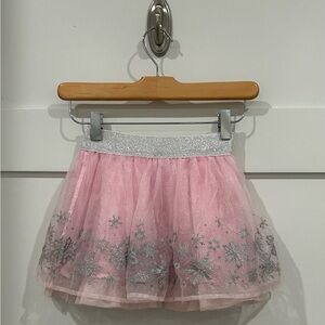 Disney Frozen tulle skirt. Pink with silver glitter snowflake and character design. Silver glitter elastic waistband. Three layers. Size XS.