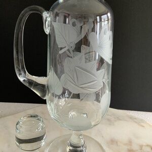 Wonderfully etched Butterflies & Flowers adorn this pedestal decanter with stopper. Great for a home bar, entertaining or wine enthusiast. Would make a wonderful gift or wedding present.