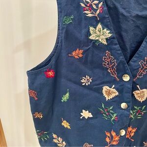 Vintage Leaves Leaf Embroidered Button Front Vest in Navy Blue 🍁 🍃 🍂