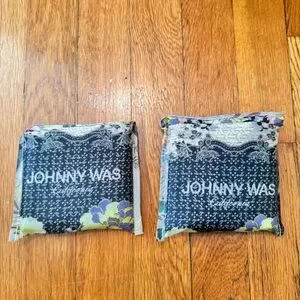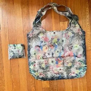 Johnny Was Reusable Shopper Tote Bags (set of 2 in mini zippered case). Foldable recycled nylon floral tote bags with double handles. Carry these convenient folding shopping totes in your purse, pocket, or car. Lightweight bags with internal small slip pocket that also doubles as the pouch to fold it away into a 4x5” square, perfect to throw in your luggage while you travel. Comes in case of 2 in mini cabana see-all case (faux leather). Never used, opened one bag to take photos. NEW without Tags. NWOT.