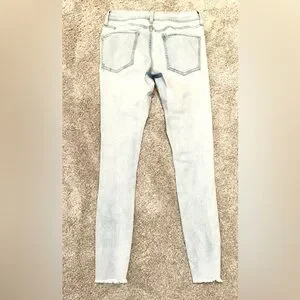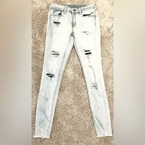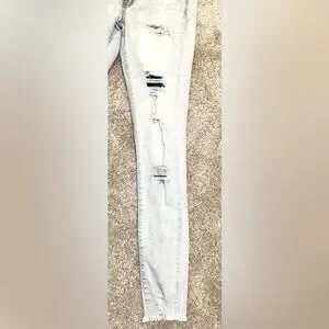 Good condition. Light blue denim. Stretchy waist. Ripped. Ripped areas have sewn darker blue denim patches in them, however some are missing. Sizing is unknown.