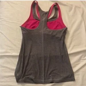 Lululemon size 8 tank with built-in bra. Gray tank with pink bra . in good condition. no stains or tears or pulls or holes. No tag inside the shirt. Bin 2