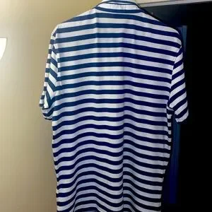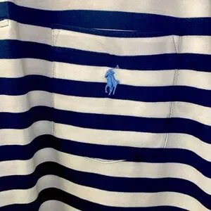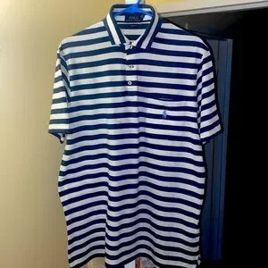Great condition mens Ralph Lauren polo shirt size medium ..color navy blue and white stripe design and has a left chest pocket
