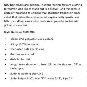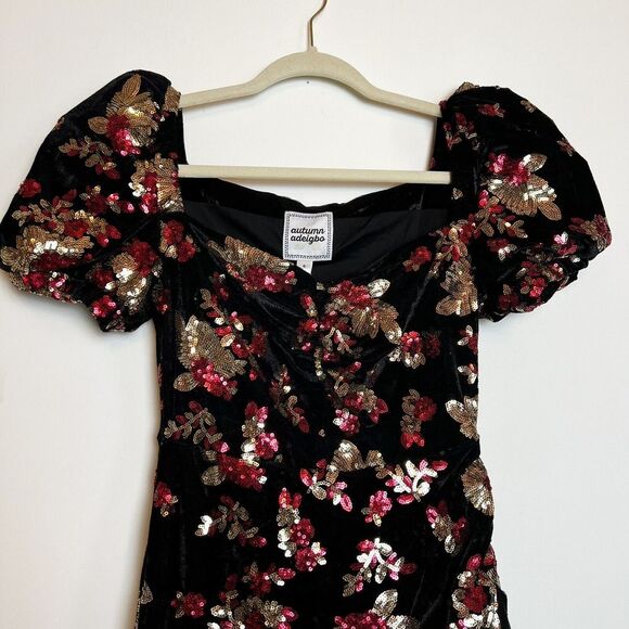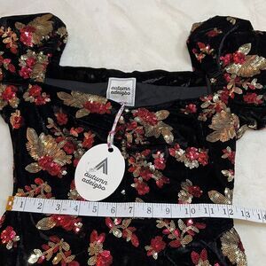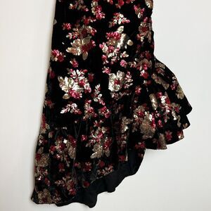 Black velvet with red and gold floral sequin print Asymmetrical hem with ruffle accent Puff short sleeves Slight sweetheart neckline