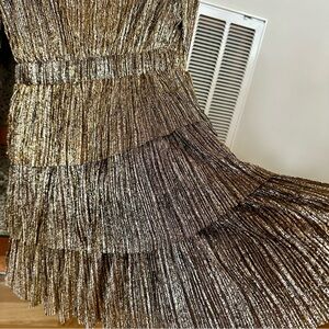 EUC, non-smoking home. Flowy, layered mini dress. Golds and black