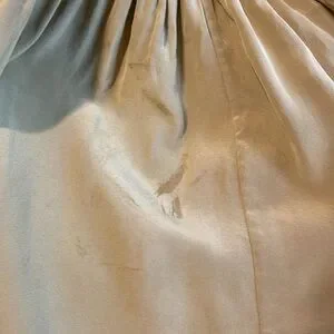 Preowned; there are spots on the front bottom tier of the dress. These may or may not come out with dry cleaning. When the dress is hanging the marks are very hard to see as they fall in between the folds.