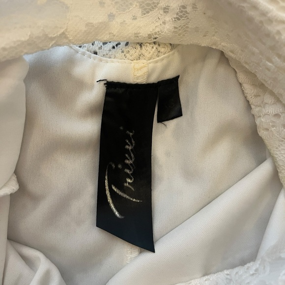 Francesca’s Trixxi White Lace High Mock Neck Shift Slip Tunic Dress size XS. VGUC Very Good Used Condition, slight spot on the inside of the neck clasp, worn once. Cool for a rehearsal dinner or late graduation dress!