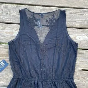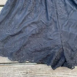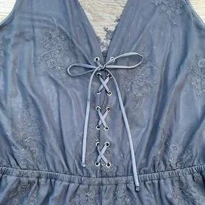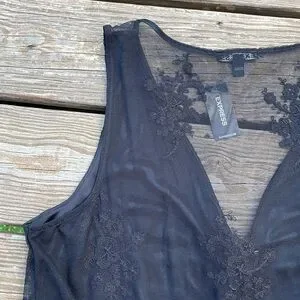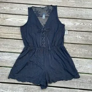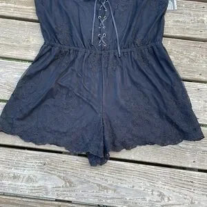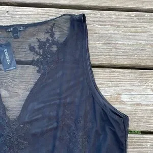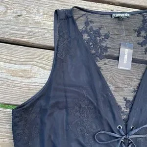 Lingerie inspired Lacey black romper by Express! Sleeveless, deep v-neck with a front tie allowing for a little or a lot of cleavage, elastic at the waist, and a silky lining throughout except for the back, the back is only lace from the elastic on up. Your booty is completely covered as is your complete frontside. So sexy, sexy, sexy should be coming to mind! Brand new with tags, never been worn, and lying flat measures approximately 32 inches shoulder to hem, 20 inches armpit to armpit, and 16 1/2 inches at the elastic waist which offers decent extra stretch. Is hand wash only.