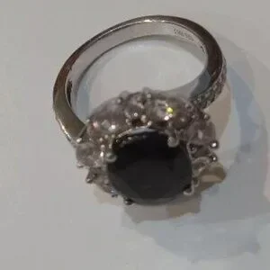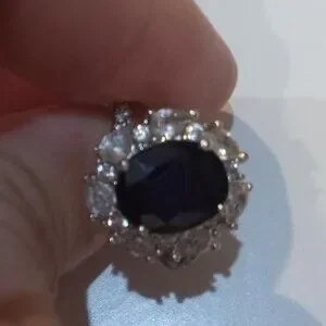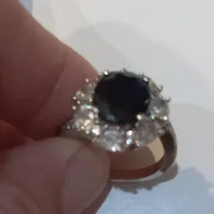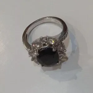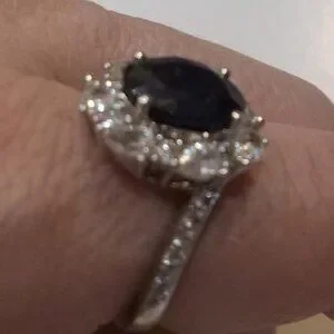 This ring is a dark blue stone surrounded by white stones in the shape of a flower. It has an asymmetrical band for a graceful statement piece of jewelry.