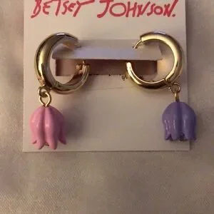Betsey Johnson Gold Tone Huggie Hoop Earrings Mismatched Tulip Charm NWT