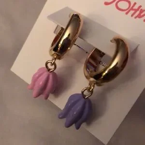 Polished gold tone Huggie hoop earrings feature on one side a 3D pink enamel tulip with a white faux pearl accent in tulip. The other Huggie has a 3D purple enamel tulip charm with a white faux pearl accent in tulip. Hinge closure. Earrings approximately 1.25” inches long. Made in China.