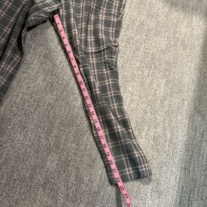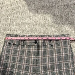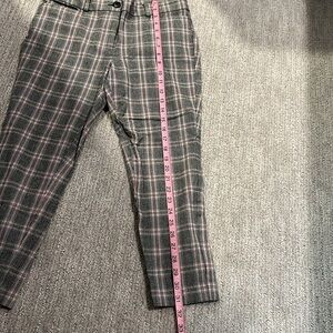 Grey pant with blue, orange, black, and white plaid