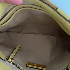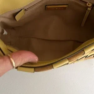 A suede and leather basketweave design elevates this compact shoulder bag detailed with yellow tone metal Double T hardware. The interior provides just enough room for organizing your devices and small essentials one side zip pocket on another side two slit pockets very clean inside in excellent condition. The Kira Small Convertible Shoulder Bag has an adjustable chain strap that adapts in the moment — doubled over the shoulder, or long as crossbody.