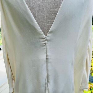 Unleash your inner dancing queen! Gorgeous silk Halston with retro vibes. Deep v-neck front and back, with ring detail. Zip closure and sheer sleeves. Think Farrah, Olivia Newton John and Abba! 🌟
