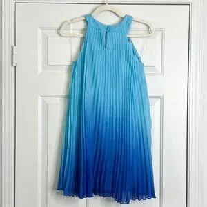 Brighten up any occasion with the Tween Diva Ombre Chiffon Accordion Pleat Dress, featuring a stunning gradient from light to deep blue. This sleeveless dress boasts elegant accordion pleats and a high neckline, perfect for making a stylish statement.