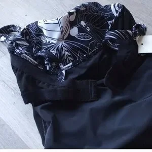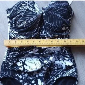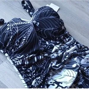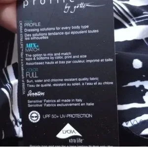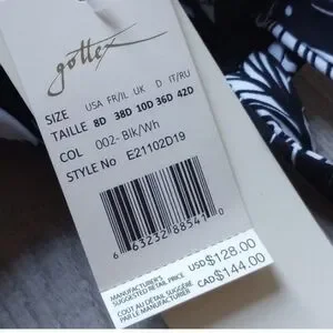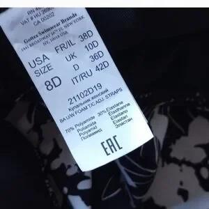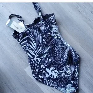 brand new with tags. gottext swimsuit. size 8 d in the USA, 38D in France, UK size 10d. colors are black and white. tropical leaf pattern size d cup. have a photo of measurements from gotex website. brand new tags. one piece bathing suit. has a bra cup inside bathing suit. sensitive fabrics all made in Italy UPF 50 plus has UV protection. no smoking home
