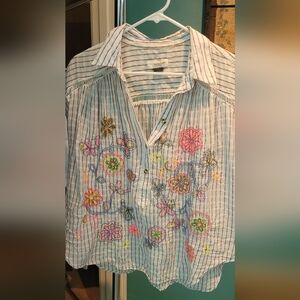 Pilcro Embroidered Shirt Button Up Striped Colorful Anthropologie Boho
