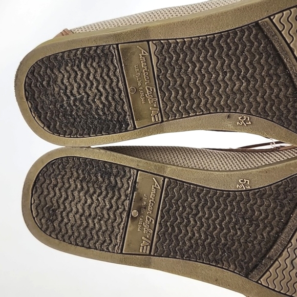 Excellent pre-owned condition, American Eagle women's lightweight loafer slip on shoe with a supple faux suede textile upper in varying shades of tan, size 5.5.