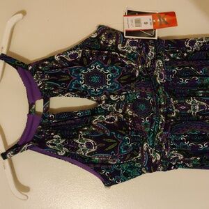 Brand new purple, green, turquoise sleeveless dress with ruched waist and ties in the back. Also zips in the back, with built in bra. Really pretty and flowy.