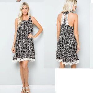 Everleigh black and cream damask print mini trapeze dress with cream crochet lace trim.