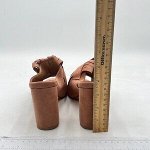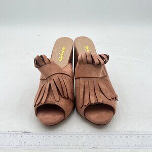 XYD Tan Open Toe Mules with Fringe High Chunky Heels Summer Slides Sandal