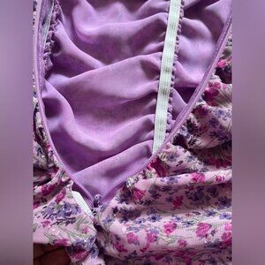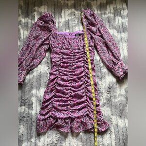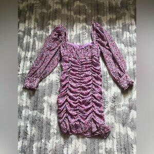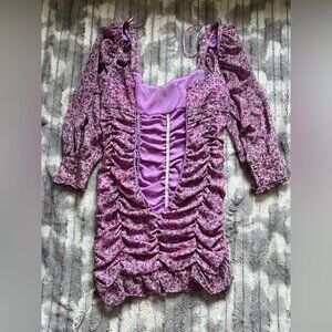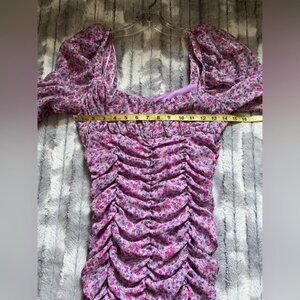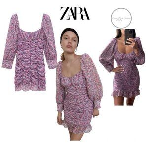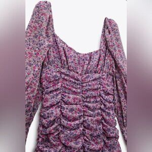 zara purple floral print ruched draped balloon sleeve bodycon mini dress