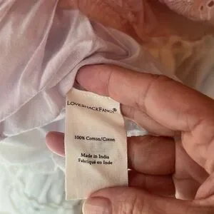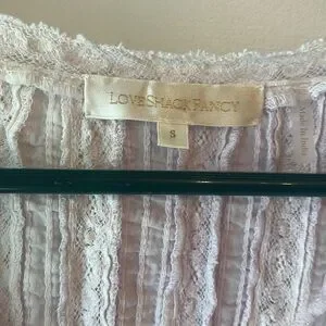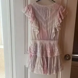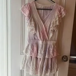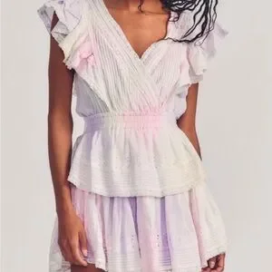 Multicolour cotton tiered ruffle mini dress from LoveShackFancy featuring a wrap style V neck, an elasticated waistband, lace inserts, a curved hem and short sleeves.