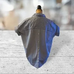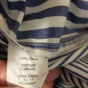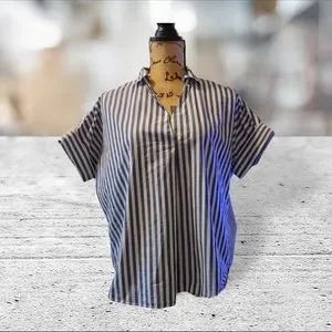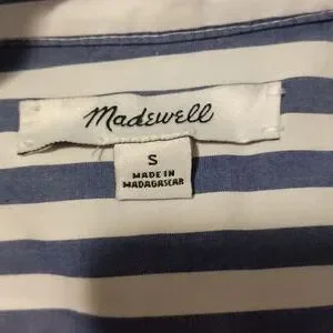 Gently worn madewell size small short sleeve, collar, v neckline . the striped pattern are in an asymmetrical pattern in back and the front stripes are vertical. refer to pictures for additional info