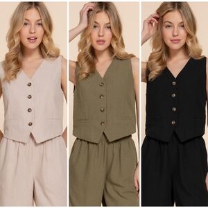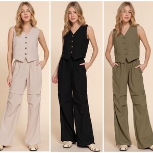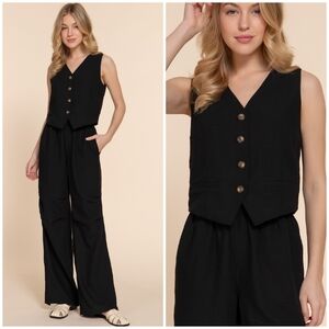 Show Off Your Style Effortlessly With This Gorgeous Wide Leg 2-Piece Vest And Pants Set ! Made of lightweight linen effect material that's perfect for warmer weather in a classic can't go wrong black color. Pants have ruched parachute front detail and side pockets with an elastic waist for best fit and comfort. Pants have adjustable width elastic on bottom hemline. Vest has button closure and is fully lined. Wear together or mix and match with separate pieces. Such a versatile set you can easily dress up or down. Sure to become a fave !!