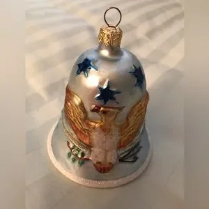 Christopher Radko Liberty Bell #94-145-1 patriotic ornament featuring a crossed flags and an eagle on a bell shape - with clapper. No box. Ornament is approximately 4" tall.